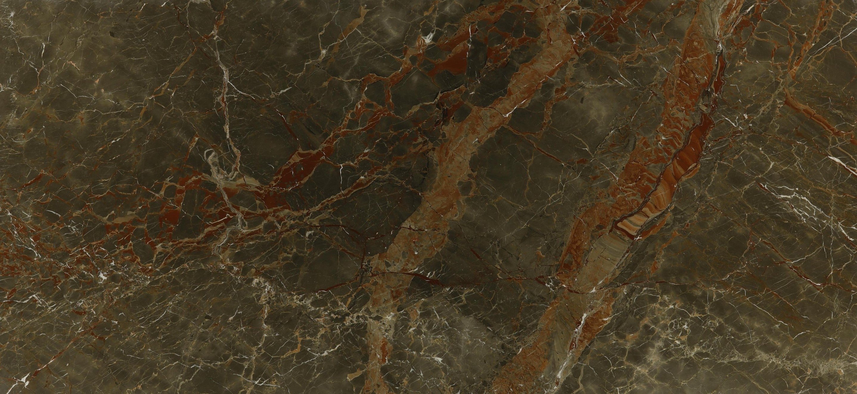 120 x 55 This dramatic natural marble reveals a deep smoky charcoal foundation infused with rich umber and burnt sienna veining that flows across the surface...