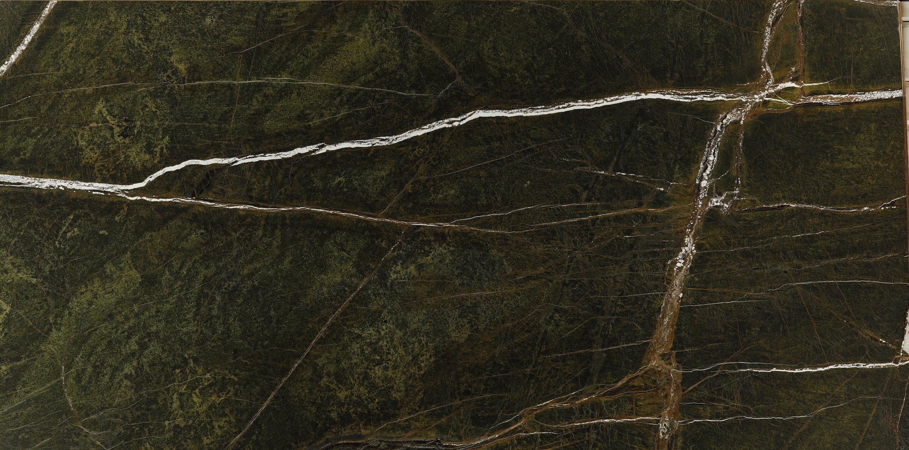 122 x 61 This captivating natural stone presents a deep olive and forest-green canvas, dramatically intersected by bold ivory fissures and fine rust-toned veining that create...