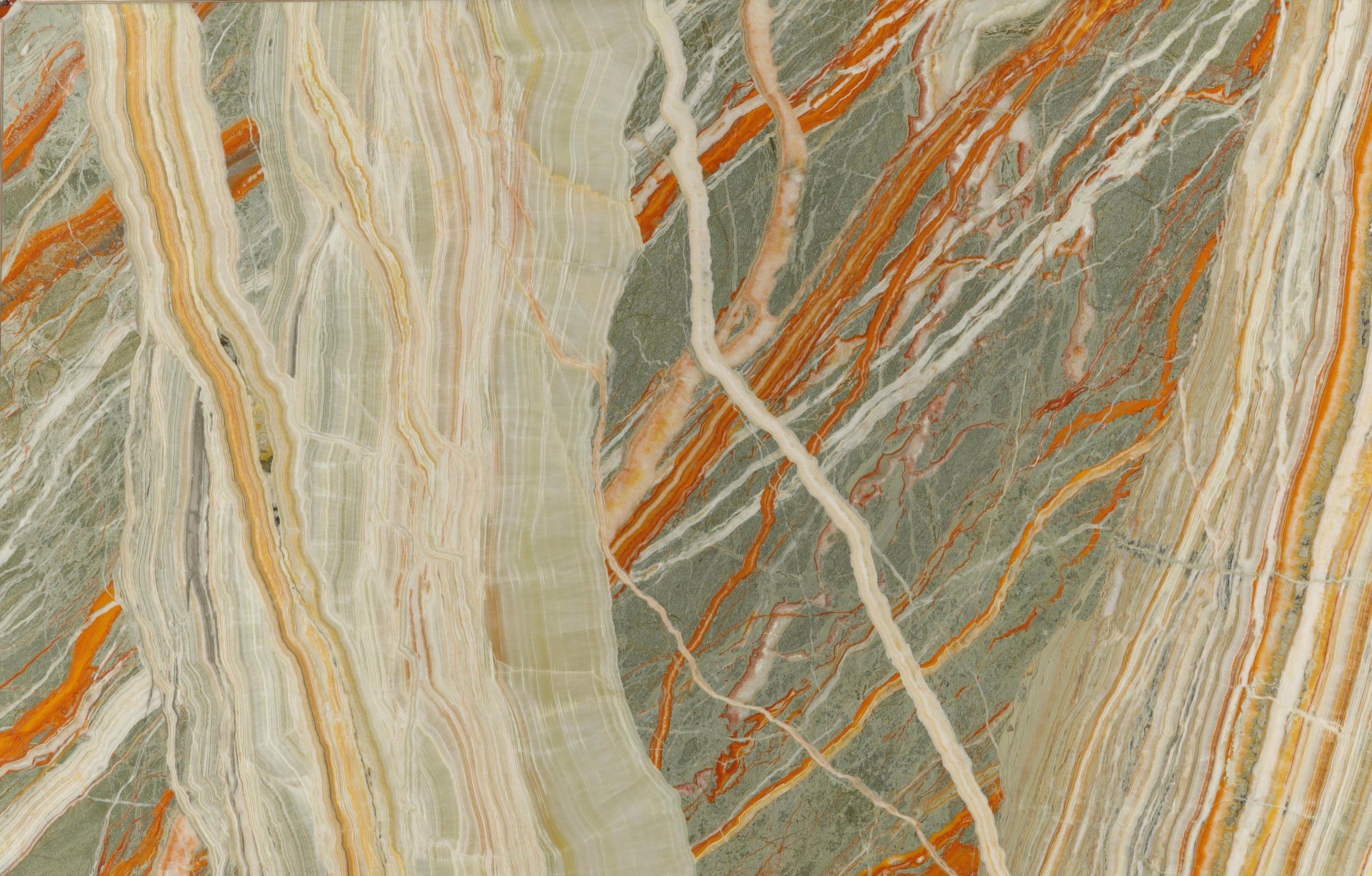 114 x 74 This extraordinary natural stone showcases flowing ribbons of sage green, celadon, ivory, and champagne, dramatically accented by bold veins of amber and burnt...
