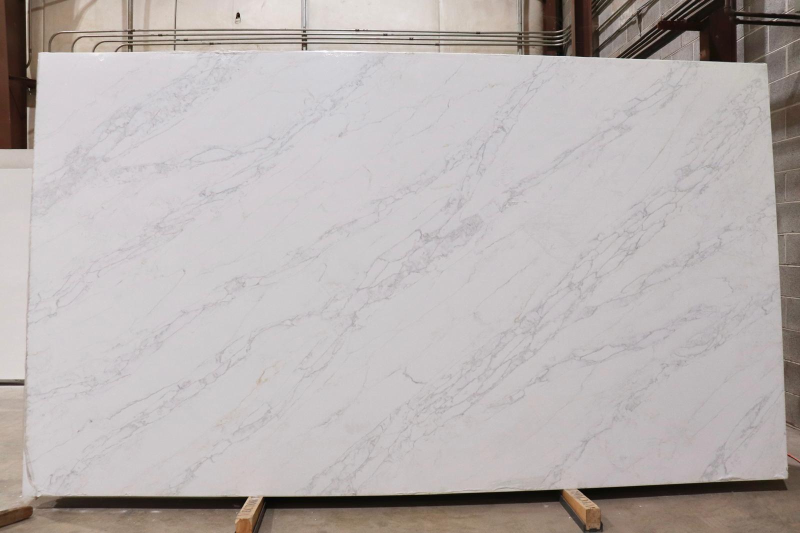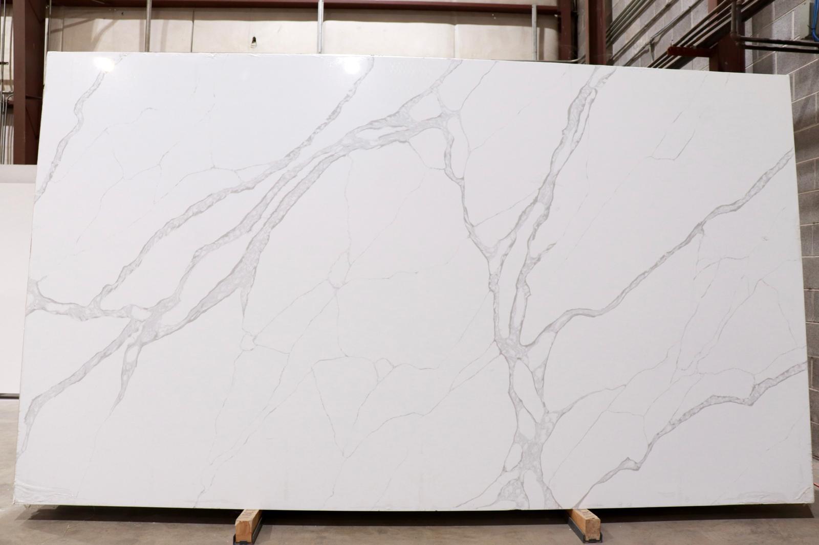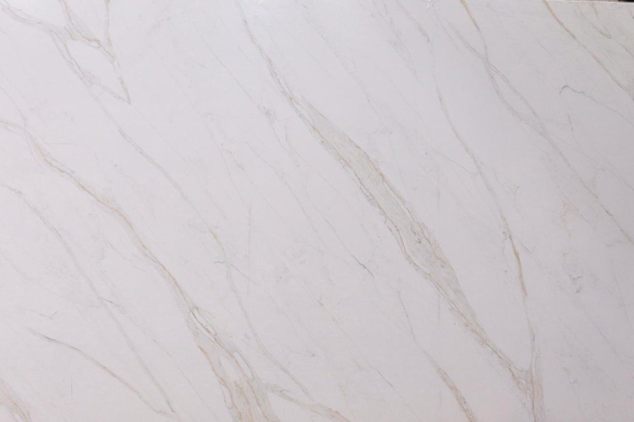 138 x 79 This quartz showcases a crisp white background with long, flowing veining in soft gray accented by warm gold tones. The movement is linear...