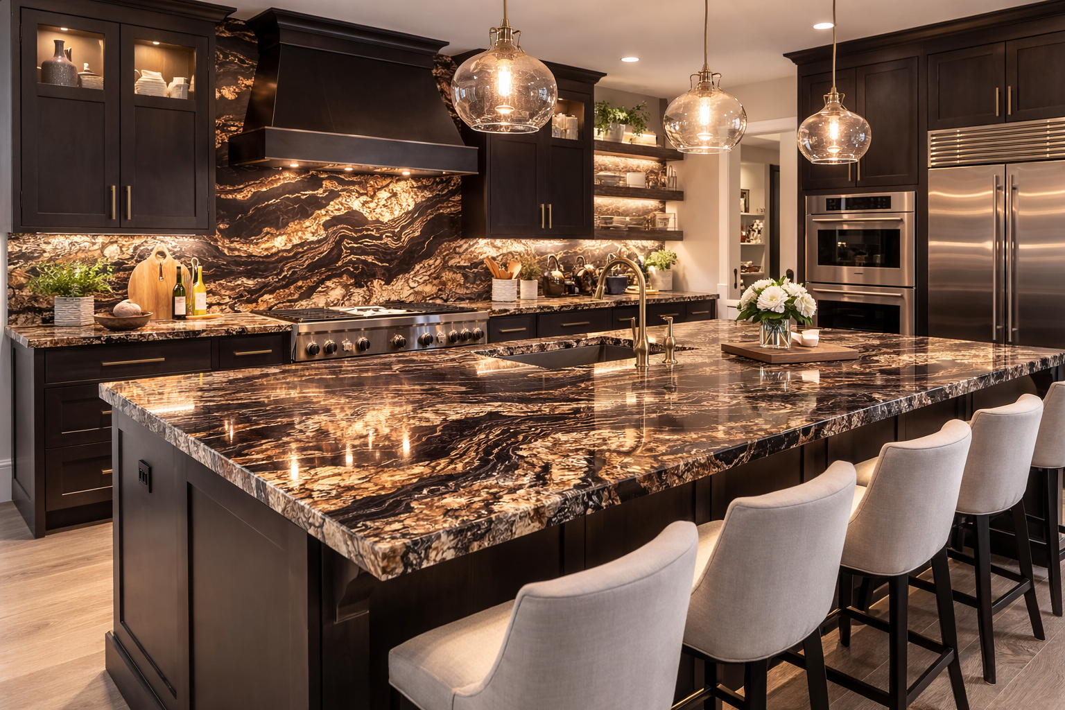 Black Taurus Granite is a dramatic natural stone featuring a deep black background with bold, flowing veins of gold, bronze, and caramel. Its striking movement and high contrast make it a statement piece, perfect for luxury kitchens, waterfall islands, and full-height backsplashes.