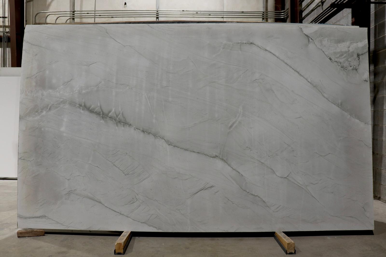 A serene blend of soft ivory and pale grey unfolds across the surface, accented by delicate, sweeping veins that move with understated elegance. Subtle yet sophisticated, this quartzite offers a refined backdrop for luminous kitchens, spa-inspired baths, and timeless architectural designs.