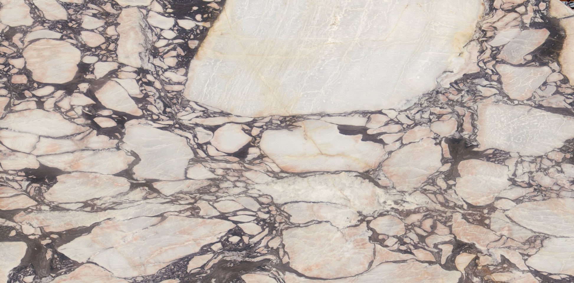 This extraordinary marble showcases a luminous ivory and soft blush foundation dramatically fragmented by intricate charcoal veining, creating a bold, mosaic-like composition with striking contrast. Refined yet artistically expressive, it is a statement material ideal for luxury feature walls, bespoke countertops, and interiors that celebrate sculptural elegance and timeless sophistication.
