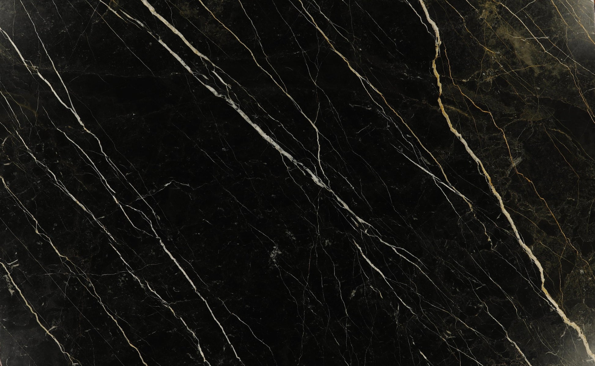 This striking marble features an intense jet-black foundation dramatically crossed by elongated veins of crisp white and warm gold, creating a bold yet refined visual rhythm across the surface. Sophisticated and commanding, it is a luxurious statement material ideal for high-end feature walls, elegant countertops, and interiors that celebrate contrast and timeless glamour.